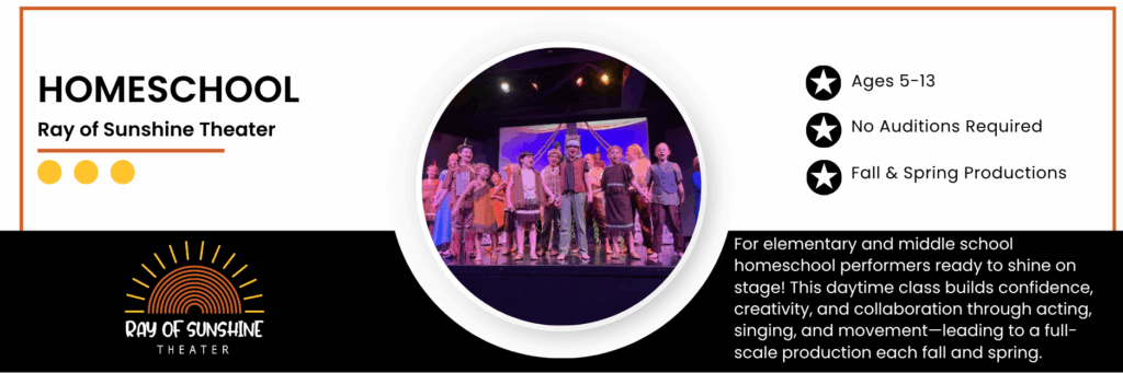 New to our theater? Here’s what to expect! Auditions will take place during the first day of class to help us get to know each performer and place them in a role that fits their strengths. Each student will participate in vocal, movement, and acting activities to showcase their talents. We assess stage presence, vocal ability, script reading, and willingness to work as part of an ensemble..
